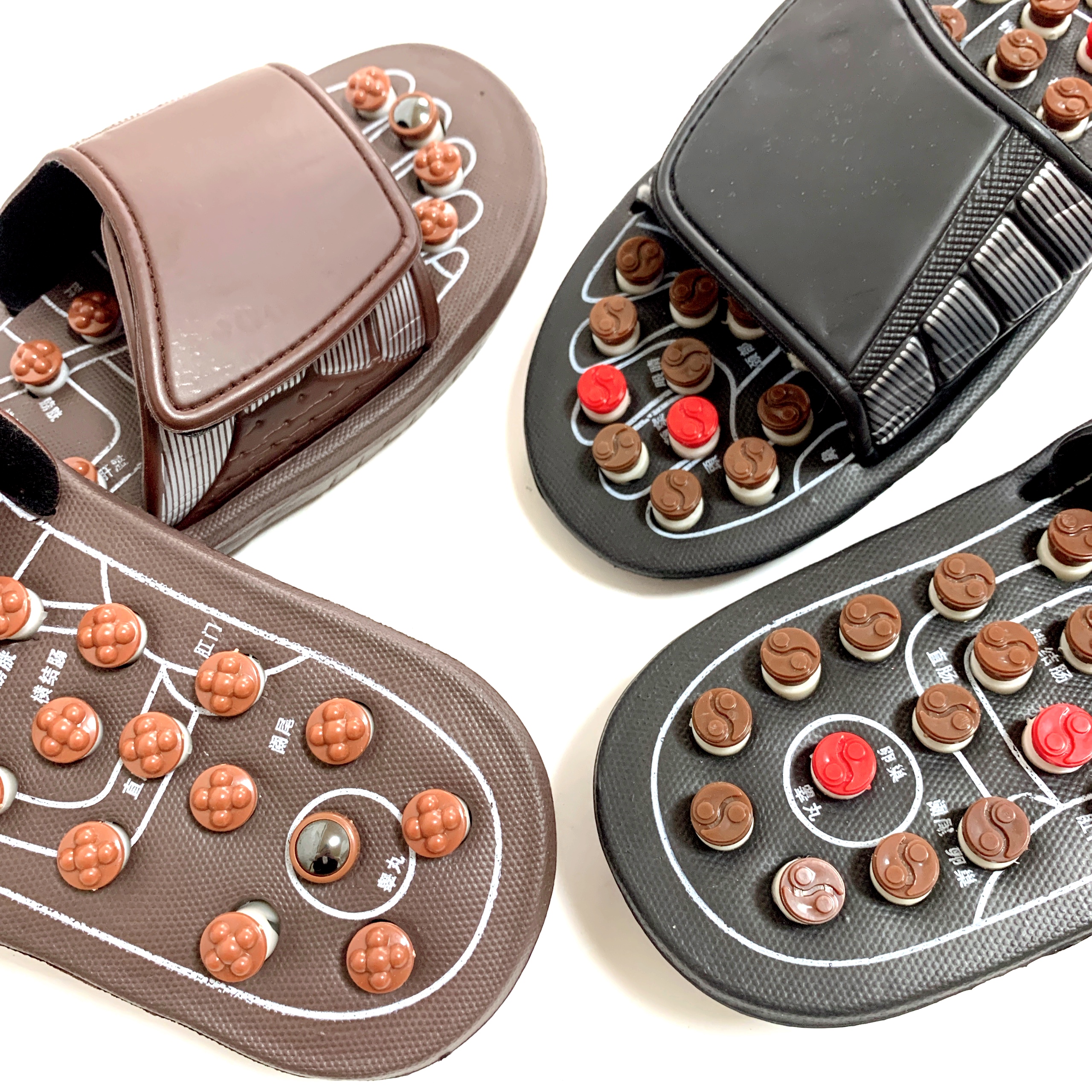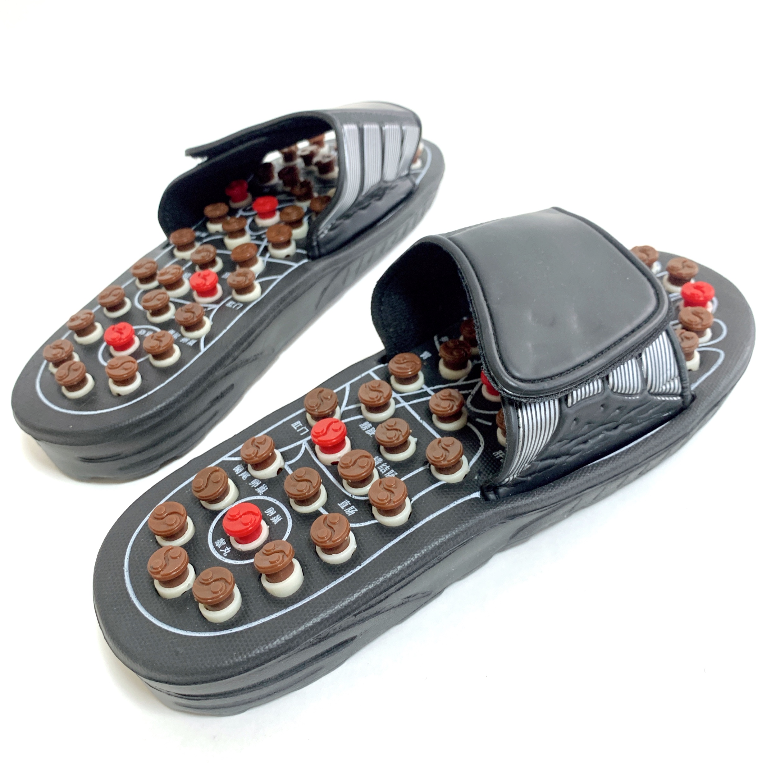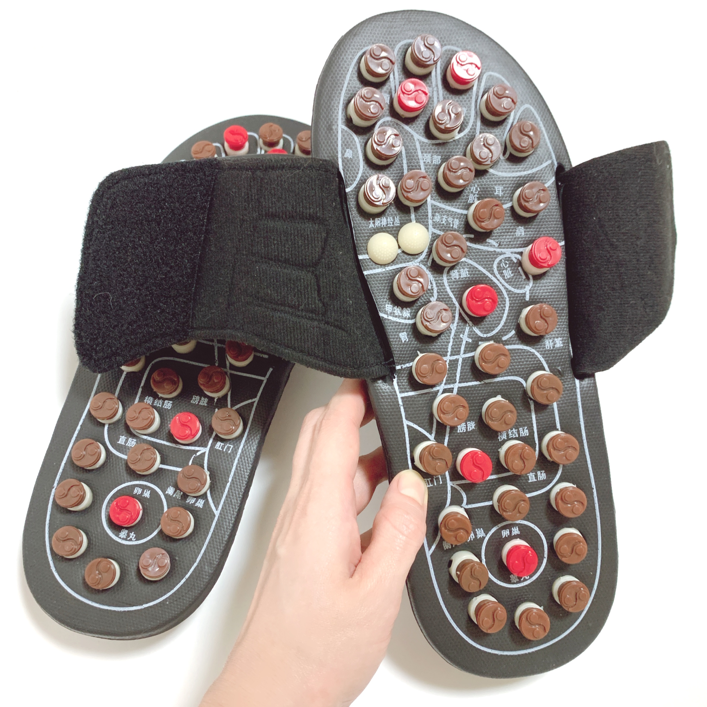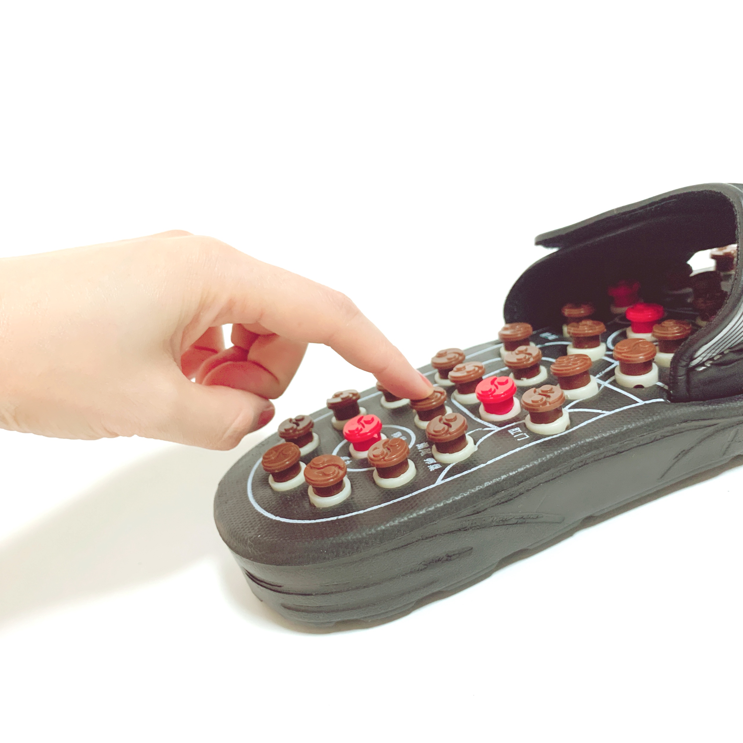 昔のごつい電卓みたいな謎のメカ感がかっこよすぎる、本場中国の足ツボサンダルです!✨ツボのボタンは、押すと回転しながら凹む造りになってて、何かより効きそうな説得力があります🍥